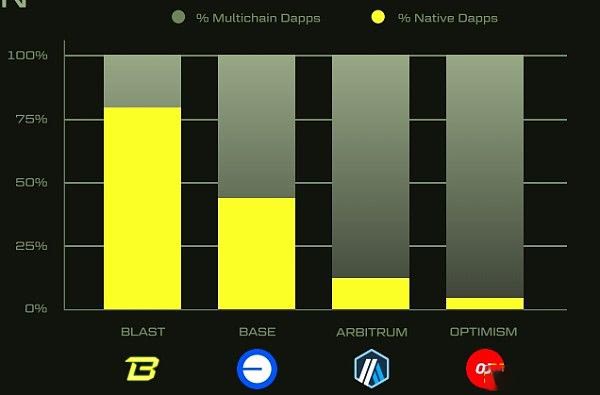 Blast 的独特之处在于为建设者提供了新的构建模块:本地收益和Gas收入共享。通过在后端与 Lido 和 MakerDAO 集成,Blast 为 ETH 和稳定币分别提供 4% 和 5% 的年化收益,位于链上的任何位置都可以。因此,Blast拥有比任何EVM链(包括L1和L2)更高的原生dapp百分比.