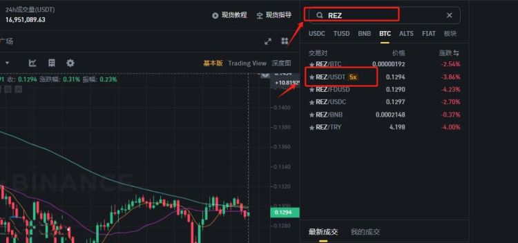 8、搜索币种简称【REZ】,选择【REZ/USDT】交易对