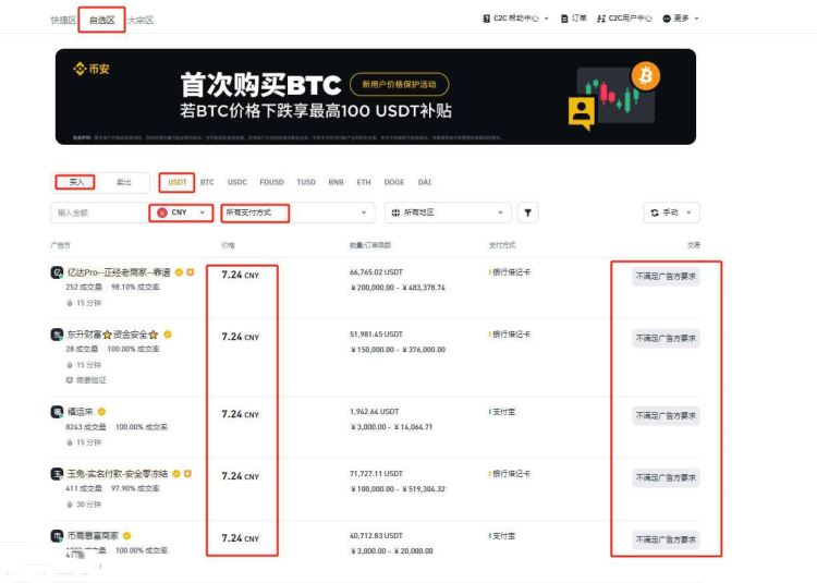 6、在进行现货交易前需要获得USDT,可在“一键买币”——“自选区”——“买入”获得,注意法币需要选择CNY,然后根据需求选择交易商家