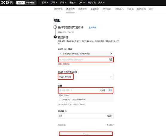 3.在提现详情提币地址处输入第5步的提现地址,提现网络选择TRC20,输入数量点击下一步(注意提现网络和充值网络需要选择一致。不然可能造成资产丢失)