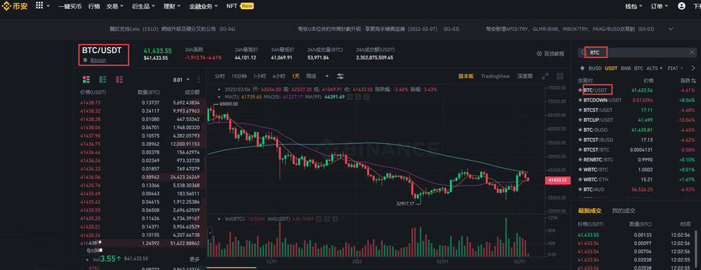 6、点击BTC/USDT交易对,进入购买页面。