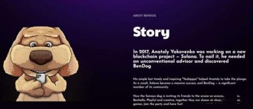 正如BENDOG 官网所述:「2017 年,Anatoly Yakovenko 正在开发一个新的区块链专案—Solana。为了解决这个问题,他需要一位非常规的顾问,而BenDog 简单但及时且鼓舞人心的“Yehppps”帮助他的尝试,并最终使Solana 取得了巨大成功」。