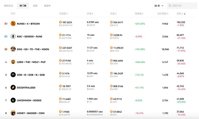 从BTC网络数据来看,交易量与交易份额方面,符文当前占网络总量的20%左右。在符文协议刚推出时,交易非常fomo,占比最高达81.3%,随后快速进入冷静期,当前,符文在网络的占比约为10–40%,结合数据可观测当前符文市场的热度如何。