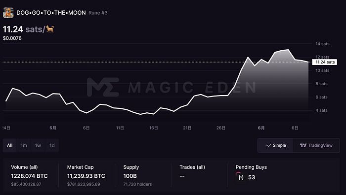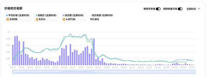 符文石NFT在Runes协议推出前进行预热,NFT价格在3–4月稳步攀升,最高一张达0.1166BTC。在第一个符文DOG空投后符文石价格跌落,而符文DOG接棒炒作,价格经过一个月市场定价和盘整后,从5月中旬开始拉升自0.0025左右拉升至最高0.0097,当前回落至0.0078。后续符文石还有两次空投(今年晚些时候与DOG成为第一meme coin时),根据DOG的价格情况或将重新拉升起符文石价格。