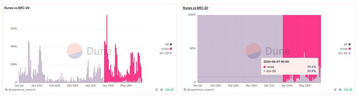 对比符文与BRC-20,当前符文已成为非BTC交易之外交易最活跃的L1资产,二者的比例在4:1左右,符文占比最高出现在减半推出时,约为99%,最低约为55%,当前符文交易热度已超越BRC-20。