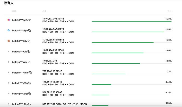 DOG的链上持有人稳定保持在7w ,排名符文第三,因主要的流动性在CEX上,实际的持有人应该依然为第一,持有人数庞大,共识强烈。但链上地址最大的持币比例为1.69%左右,,且近日在不断减持,超过1%的仅有5个地址,排名第五的地址在快速增持,但整体筹 码程度的不够集中,可能造成了虽然当前龙一地位明确但无法上一线CEX的原因。