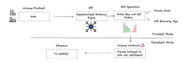 我们来看Uniswap的v4设计,它可以与托管在专用AVS节点上的去中心化匹配引擎相结合。这个操作员池可以有效地将数千个交易请求与对手方匹配,创建一个在链上结算的交易包。