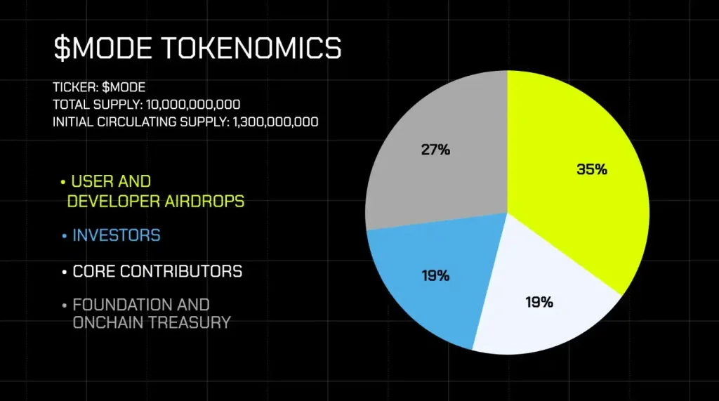 此外,MODE 的总供应量为100 亿枚,其中初始流通供应量将为13 亿枚,流通市占率部分来自第一季空投奖励,部分来自基金会和链上财库。