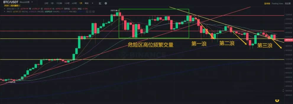昨夜十点美·国公布5月一年期通胀率公布值为3.5%,高于预期值,紧接着美联储博斯蒂克讲到,预计美联储可能只在今年晚些时候降息一次。老··美通胀导致加息预期延后,并由预期的两次加息降到一次。大饼也是应声下跌3000点,白天努力上攻我们重点关注的63800位置失败,整体空头占据绝对优势。从日线看,昨日收线实体大阴线,目前处于日内震荡,技术面需要修复,日内重点关注反弹61800和62200。按照前日讲到的下跌第三浪来看,短期重点关注53000-54000。