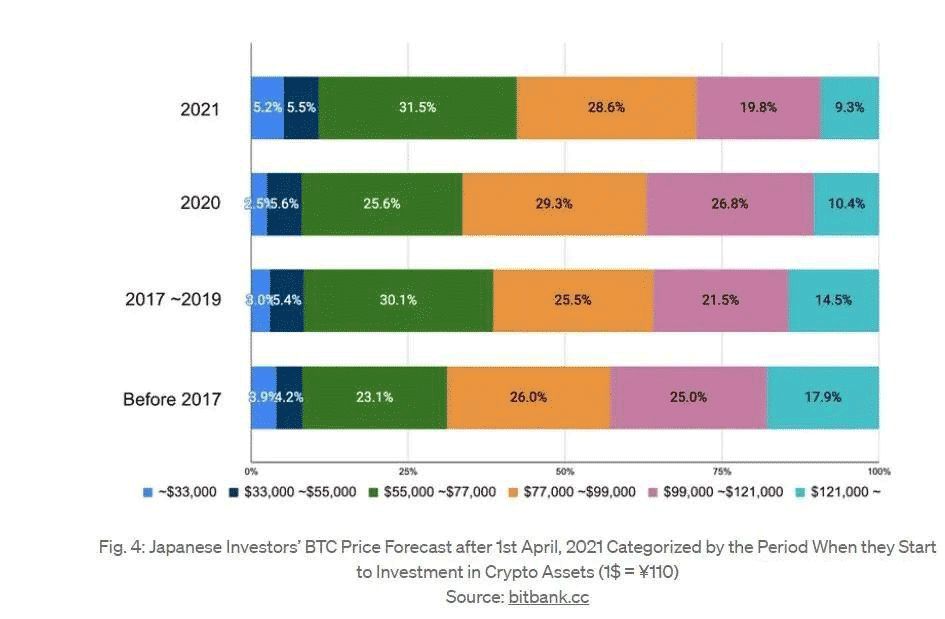 图4:2021年4月1日后日本投资者按开始投资加密资产时期分类的BTC价格预测(1美元=110日元)