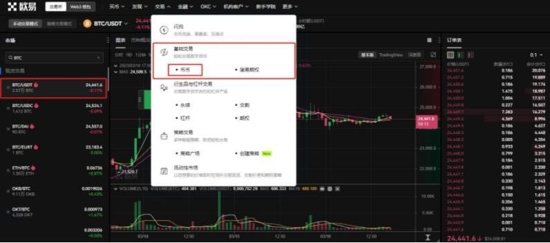 5、购买后,选择基础交易——币币,进入交易页面,选择BTC/USDT交易对,就能看到行情。