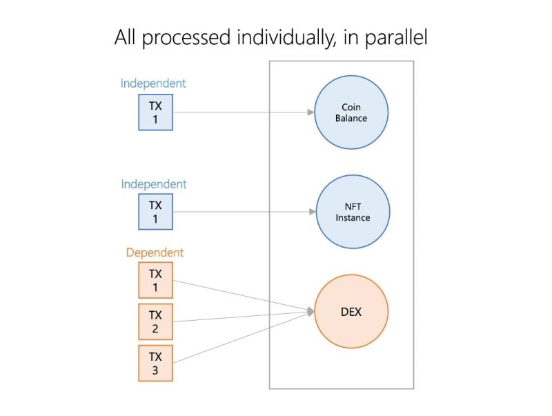区块链中的并行执行意味着同时处理不相关的交易。把不相关的交易看作互不影响的事件。例如,如果两个人在不同的交易平台上交易代币,他们的交易可以同时处理。但是,如果它们在同一平台上交易,则可能需要按照特定的顺序执行交易。