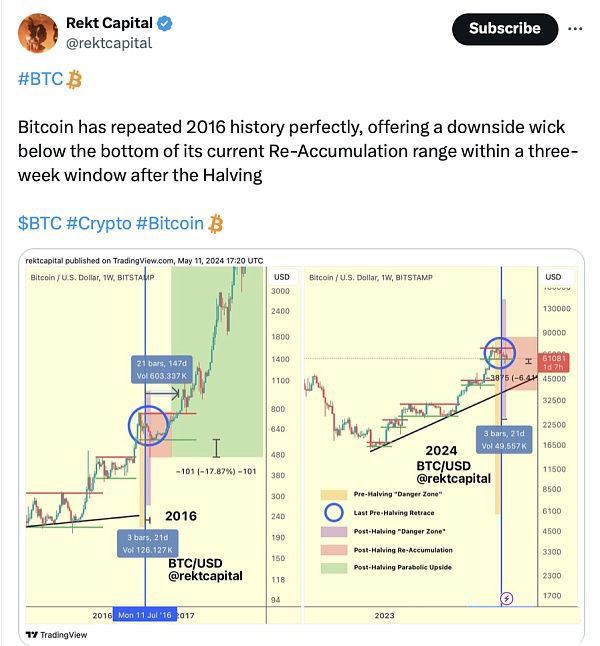 匿名加密货币交易商 Rekt Capital 在 5 月 11 日的 X帖子中宣称:“比特币完美地重复了 2016 年的历史,在减半后的三周时间内,比特币出现了低于当前重新积累区间底部的下行烛线。”