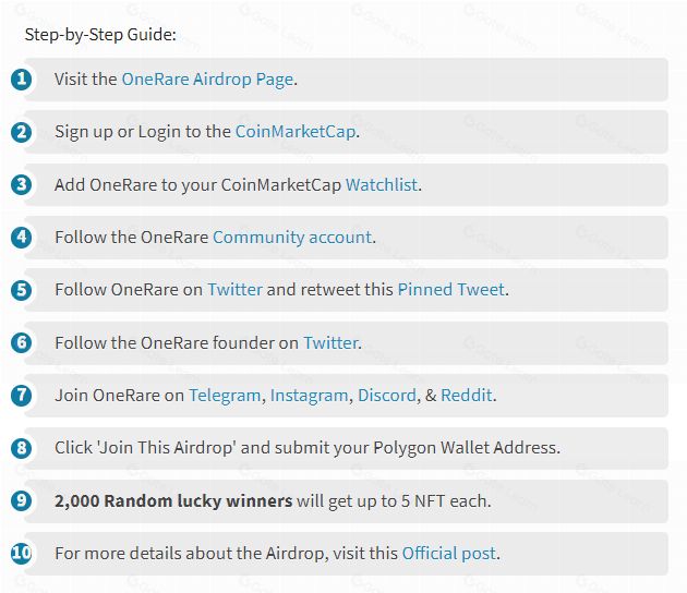 NFT 平台 OneRare 进行了一个有据可查的赏金空投示例,该平台提供了 75,000 美元的奖池。参与者必须完成九步流程,包括关注多个社交媒体帐户并在 CoinMarketCap 上关注该项目,才能获得资格。