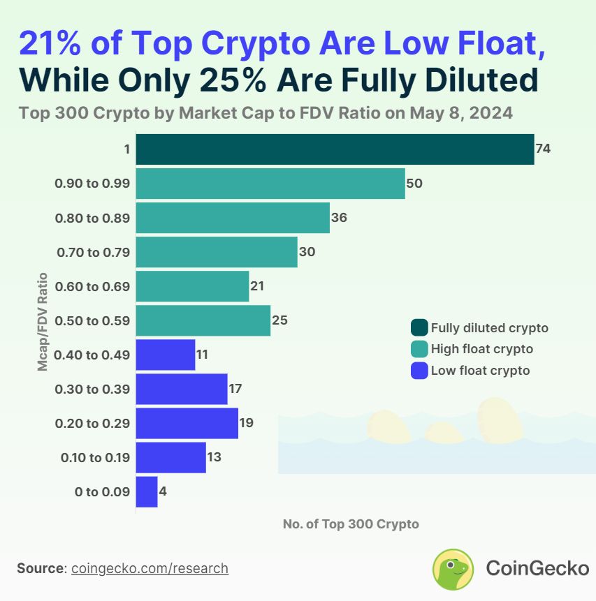 低流通量加密货币统计!本研究使用了CoinGecko的数据,对于截至2024年5月8日的市值前300名加密货币进行了研究,排除了稳定币和封装资产。对于没有最大供应量的加密货币,全面稀释估值被视为与市值相同。