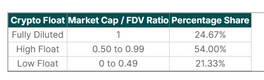 为了本研究的目的,低流通量加密货币被定义为市值与FDV比率为0至0.49的加密货币,高流通量加密货币的比率为0.50至0.99,只有比率为1的加密货币被视为全面稀释。