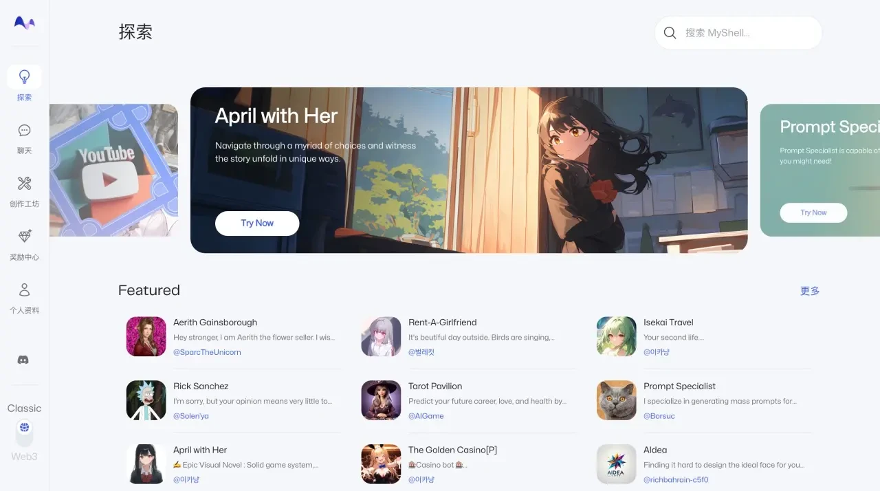 MyShell 目前分为 Web2 和 Web3 两个版本,用户可以与大量各种类型的 AI 机器人与之对话,也可以创建自己的机器人角色。