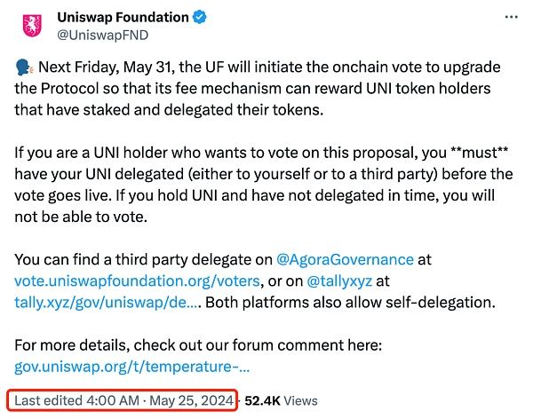 虽然最初的投票不会立即激活费用,但它为未来的投票奠定了关键的基础,这些投票将决定Uniswap V3中费用实施的细节。要参与这一关键投票,UNI持有者必须在5月31日截止日期前将其代币授权。这一授权程序允许他们直接投票或将投票权委托给第三方代表。Agora和Tally等平台为这一授权过程提供了便利。