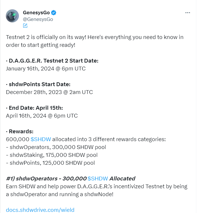 在2023年即将结束之际,项目有了进一步的进展,12月29号,GenesysGo官方发推表示将会上线D.A.G.G.E.R.测试网2的启动,也透露了相关的奖励。