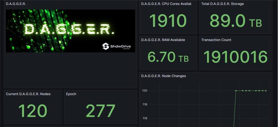 - 数据存储:上传到 DAGGER Hammer Demo 的 1MiB 文件需要 2-8 秒,该演示模拟 shdwDrive v2 存储应用程序的部分内容。