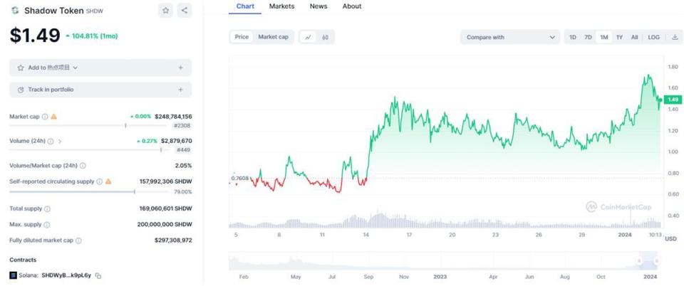 截止撰稿时,目前$SHDW现价$1.71,市值约为$258.6M,近7天/30天/1年代币价格表现如下: