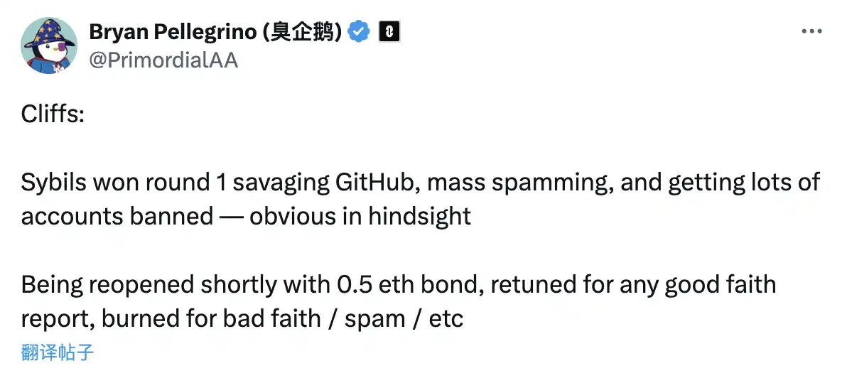 第三阶段在实际执行中也发生了一些小插曲。起初,该阶段的「赏金」活动系基于 Github 运行,但 LayerZero 显然低估了用户的举报积极性,许多人甚至完全是出于碰运气的想法疯狂提交报告,致使 Github 以垃圾邮件攻击为由封禁了不少账户。