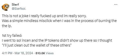 3 月18 日下午,SLERF 创办人发文承认了自己的错误,他表示,自己在燃烧流动性代币的过程中,不小心将流动性池代币(LP)、空投预留代币、以及著币全都烧毁了。