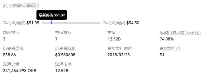 OKB当前价格为 $51.89,24 小时交易额为 26,246,388.27。OKB的价格在过去 24 小时内下跌了 3.78%。目前,该币种市值排名为第 7 名,实时市值为 $12,529,099,846.22,流通供应量为 241,454,998 OKB,最大供应量为 300,000,000 OKB。我们将实时更新 OKB/USD 的价格。