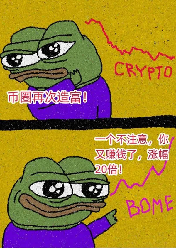 bome是一个SOL链上的meme,关于爆火的原因我给大家普及一下:创始人Darkfarms1 是加密艺术圈蛮有影响力的 pepe meme艺术家,前天他在sol链上发起了bome项目,方式类似 people,直接打钱就行,24小时捐款超过了1万个SOL,价值170 美金,然后 Darkfarms1的格局非常大,他把募集的资金全部加到池子里了,就这样 bome 爆火了加密圈。