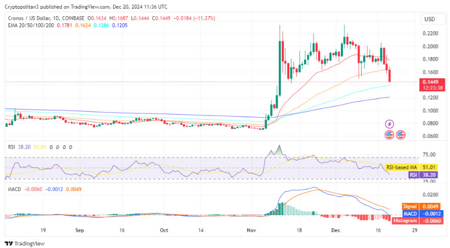 日线图上, CRO已跌破 0.16 美元的关键支撑位,表明看跌压力加大。该代币 0.1626 美元的 20 天指数移动平均线 (EMA) 也被突破,表明空头目前处于控制地位。与此同时,如果抛售压力持续存在,50 日均线 0.1387 美元可能会成为下一道防线。除非CRO迅速恢复更高水平,否则该 EMA 设置预示着潜在的趋势逆转。