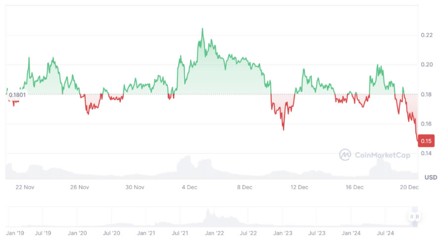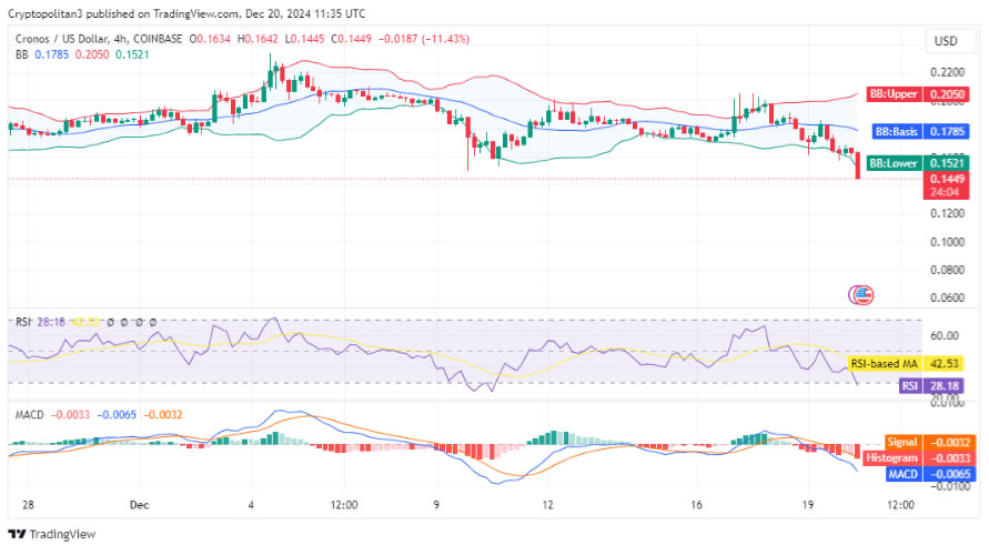 12 月 20 日 Cronos CRO价格分析显示大幅下跌,代币交易价格为 0.1508 美元,过去 24 小时下跌 17.6%。这标志着该代币的大幅回调,该代币在本月初经历了tron g 反弹。目前市值为40亿美元,24小时交易量为7664万美元,交易活动下降25.23%。价格和交易量的下降凸显了投资者在近期看涨势头之后兴趣的降温。