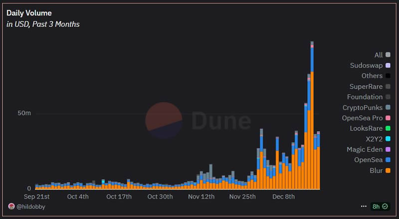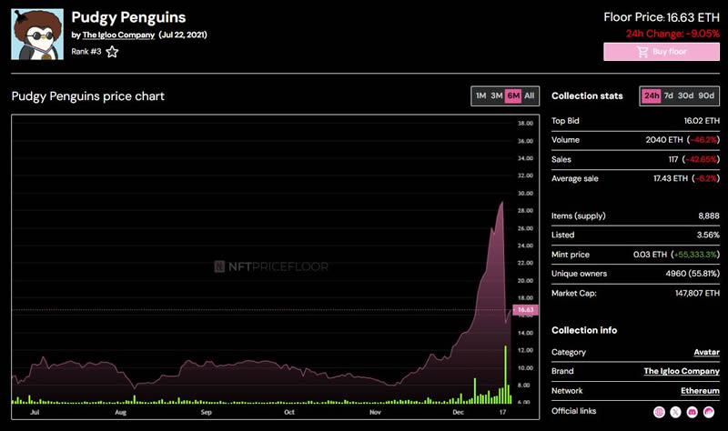 最后说到最近的市场热点就是沉寂已久的NFT 市场,成交量与地板价都有很大幅度的拉涨,尤其是以太坊上的头部项目。