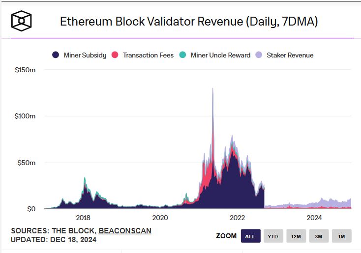 以太坊升级POS 机制后,链上收入下降许多,但依旧能从此数据分析链上活跃度,而这部分相比2023 年有显著的增长,但主要增加为质押收入而非交易费用,代表链上活动并无增长,而是在质押者与质押以太币数量上有增长。