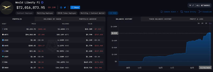 另外一个热门议题便是川普的加密友好政策,其家族DeFi 项目World Liberty Financial 最近积极买入DeFi 相关资产,包含Link、Ondo、Aave、Ena 等代币,其中不乏以太坊主流协议与RWA 赛道新兴协议,根据Arkham 资料显示,其钱包目前持有最大宗就是以太币,可能川普家族也承认了以太坊DeFi 领域的发展潜力。