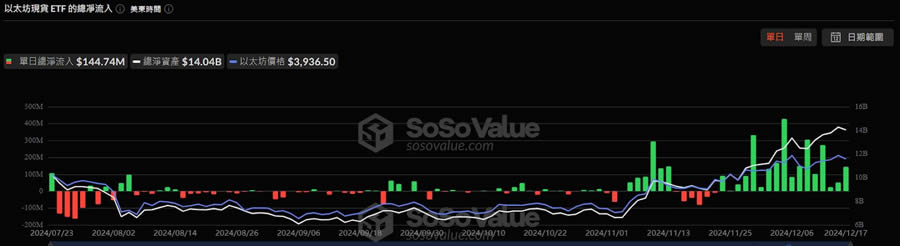 再来看到ETH ETF 的流入流出情况,根据Sosovalue 的数据显示,截至撰稿时,ETH ETF 今年累计流入24.6 亿美元,很明显大多的流入都聚集在11 月之后,正是川普胜选后,一定程度上美国机构与投资人确认政治风向后的决策,的确将ETH 纳入资产配置考量当中,无疑这是好的风向。