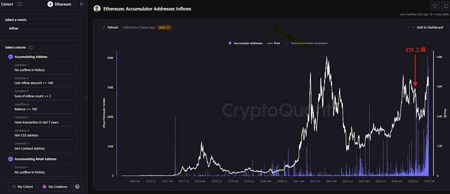 值得注意的是,从持币地址上来看,持有超过100 颗ETH 的地址不断的流入,在ETF 通过并上线之后,开始出现历史以来最大的流入状况,而近期川普上任后,更是出现密集的大额流入,并且成交价格大部分落在3000 以上,代表这些巨鲸并不认为以太币目前的价格是贵的,反而不断的买入,似乎在预示着以太坊未来价格将持续上涨。
