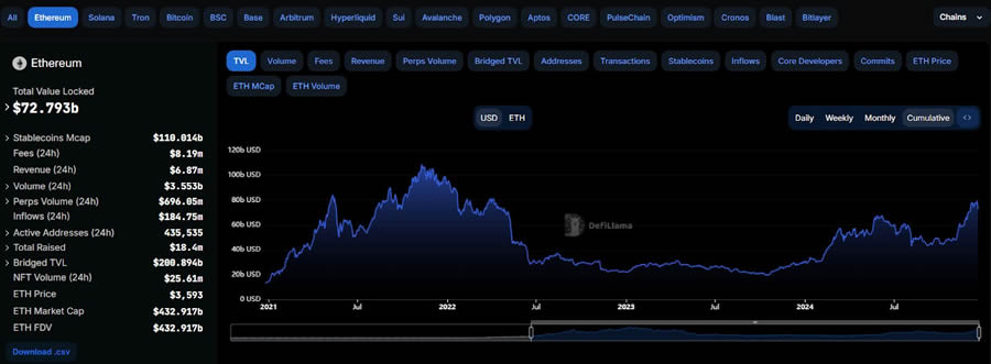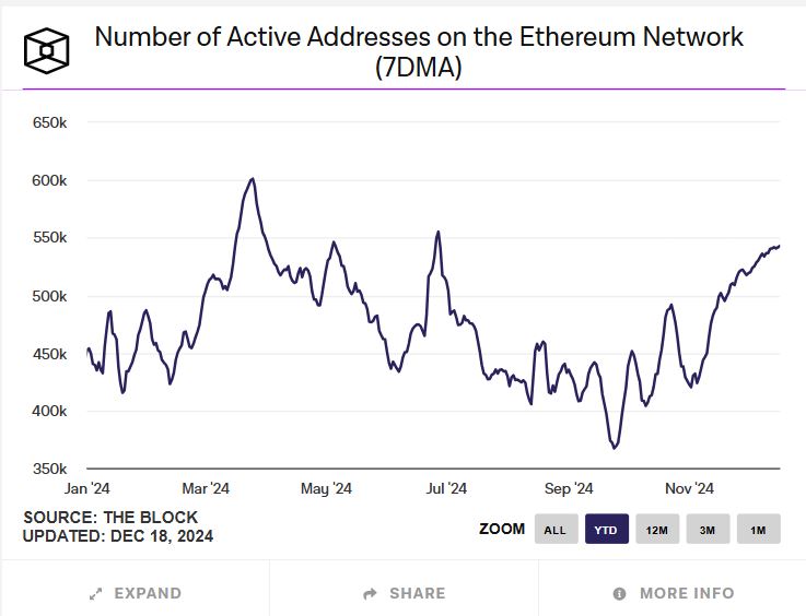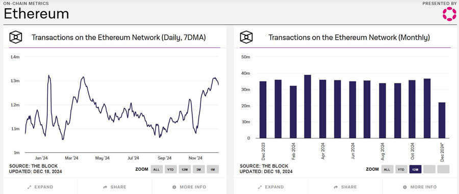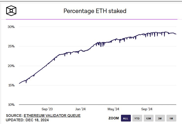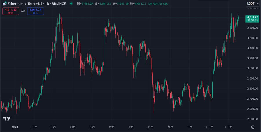 11 月川普确认当选后,加密市场迎来狂欢,以太币也重回4000 美元大关,但距离前高4868 还有20% 的涨幅,而BTC、SOL、BNB 等主流加密货币此时都已突破前高,相比年初价格分别实现150%、120%、140% 涨幅,加密市场总市值也从1.8 万亿美元暴涨至3.8 万亿美元,成长率达110%,而ETH 仅实现66% 涨幅,表现不如大盘。