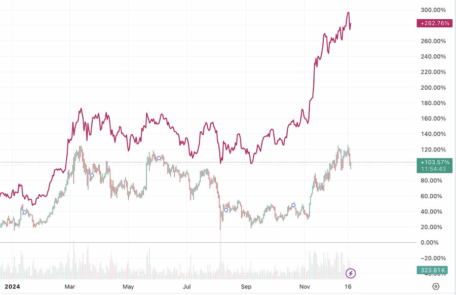 上图为比特币与以太币今年的涨幅差距,BTC 为282.7%,ETH 为103.57%