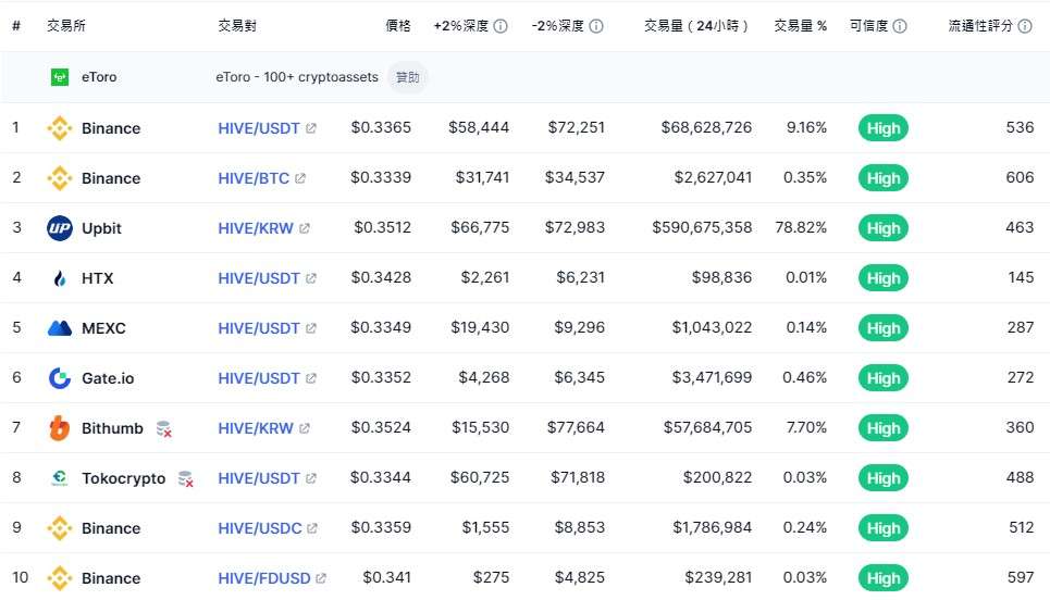 在开始购买之前,请确保您的平台支援HIVE。以下为当前上架HIVE 币现货的交易所榜单: