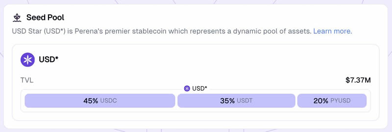 - 种子池(Seed Pool):由USDC、USDT、PYUSD 等受信任且高品质的稳定币组成,是核心的流动性池,支持交易与稳定币交换。