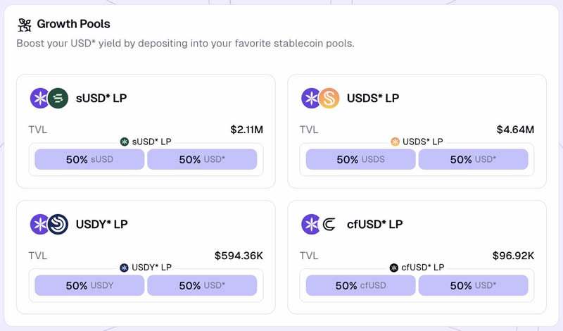 - 增长池(Growth Pools):提供更高回报,但需要更多资产投入。增长池内有多个LP 池子,分别由USD* 和合作伙伴的稳定币组成,适合追求高回报的用户。