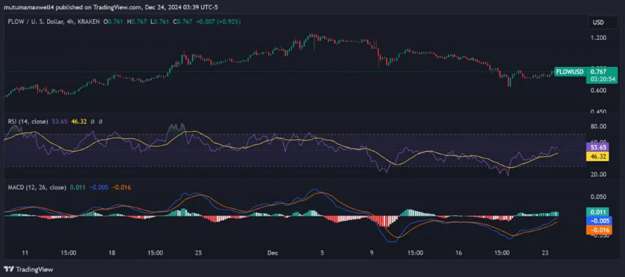 相对强弱指数 (RSI) 位于 53.65,高于中性 50 水平,表明买盘压力不断增加,但并未进入超买区域。这些指标表明 Flow 的短期势头有利于进一步上涨,但交易者应留意更高水平的潜在阻力。