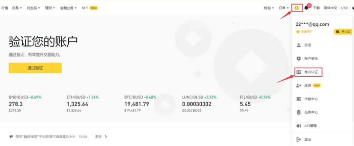 4.登录币安账户,在首页【用户中心】--【身份认证】进行身份认证,在该页面可以查看当前认证级别,它决定了您的账户在币安的交易限额。如需提升额度,请依次完成各个级别的身份认证。