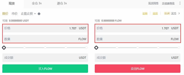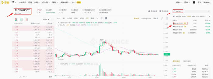 6.在右侧搜索框搜索币种简称FLOW,选择FLOW/USDT交易对