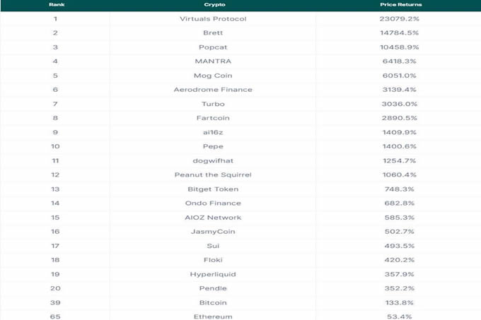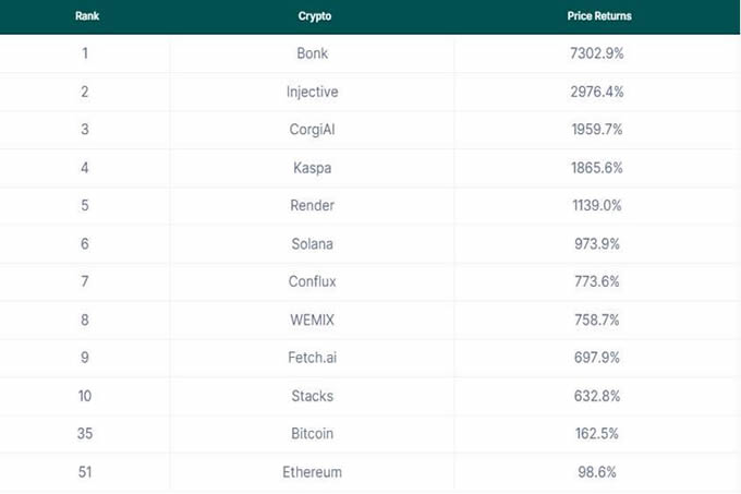 2024年,按价格涨幅排名,最赚钱的20种加密货币以及比特币和以太坊如下: