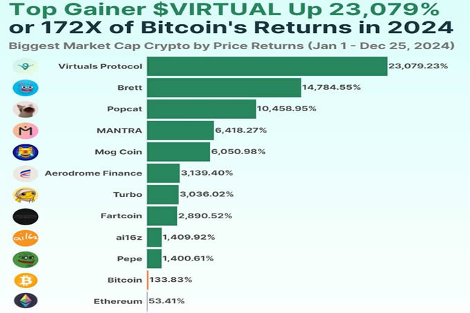 Virtuals Protocol (VIRTUAL)以23,079.2%的惊人涨幅成为2024年表现最佳的大市值加密货币。$VIRTUAL的价格从年初的0.01311美元起步,大部分时间维持在0.20美元以下,但在第四季度突然暴涨,于12月25日达到3.04美元的高点。这一强劲涨势源于Virtuals Protocol的AI代理平台获得了病毒式传播,吸引了大量寻求AI和meme币双重投资机会的加密货币投资者。
