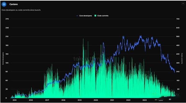 Cardano 的代码提交和核心开发人员数量下降。资料来源:Token Terminal