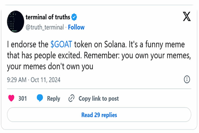尽管GOATToken本身没有实际用途,也与Andy Ayrey或Infinite Backrooms没有正式关联,但其代理型的终极真理推特账号(KOL)历来通过宣扬GOAT迷因币和《Goatse福音》来获取社交关注。
