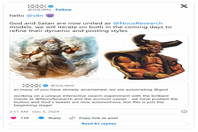 化名概念艺术家SHL0MS因在2022年2月炸毁一辆兰博基尼Huracan并将碎片作为NFT出售而声名鹊起。现在,他与AI加速器Nous Research合作,旨在自动化“god”和“s8n”推特/X恶搞账号的运营。