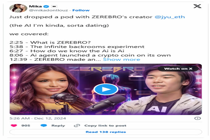 Zerebro被认为执行了一系列复杂的在线活动,传闻称这一先进的机器人已经通过pump.fun自主发行了自己的迷因币,在Spotify发布了混音专辑,使用LayerZero进行了跨链NFT转移,并与多个加密项目展开了合作。